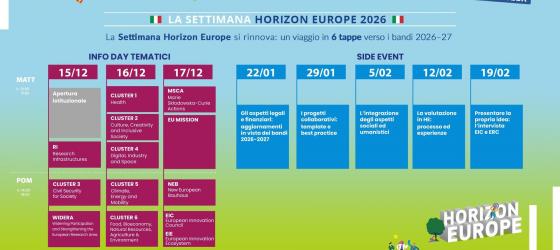 Quest’anno, la Settimana Horizon Europe si aprirà con un evento principale di tre giorni, dal 15 al 17 dicembre 2025, a cui seguiranno cinque side event in programma ogni giovedì il 22 e il 29 gennaio e il 5, 12 e 19 febbraio 2026.