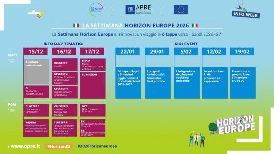 APRE in accordo con il MUR organizza la Settimana Horizon Europe 2026 dedicata alla presentazione dei bandi 2026 e alle numerose opportunità di finanziamento per i ricercatori e gli innovatori italiani.